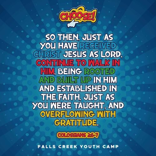 Each year, the emphasis of Falls Creek Youth Camp follows a rotation of evangelism, the character & nature of God, and spiritual disciplines. This year, we will explore spiritual disciplines of the Christian life. In Christ we are: